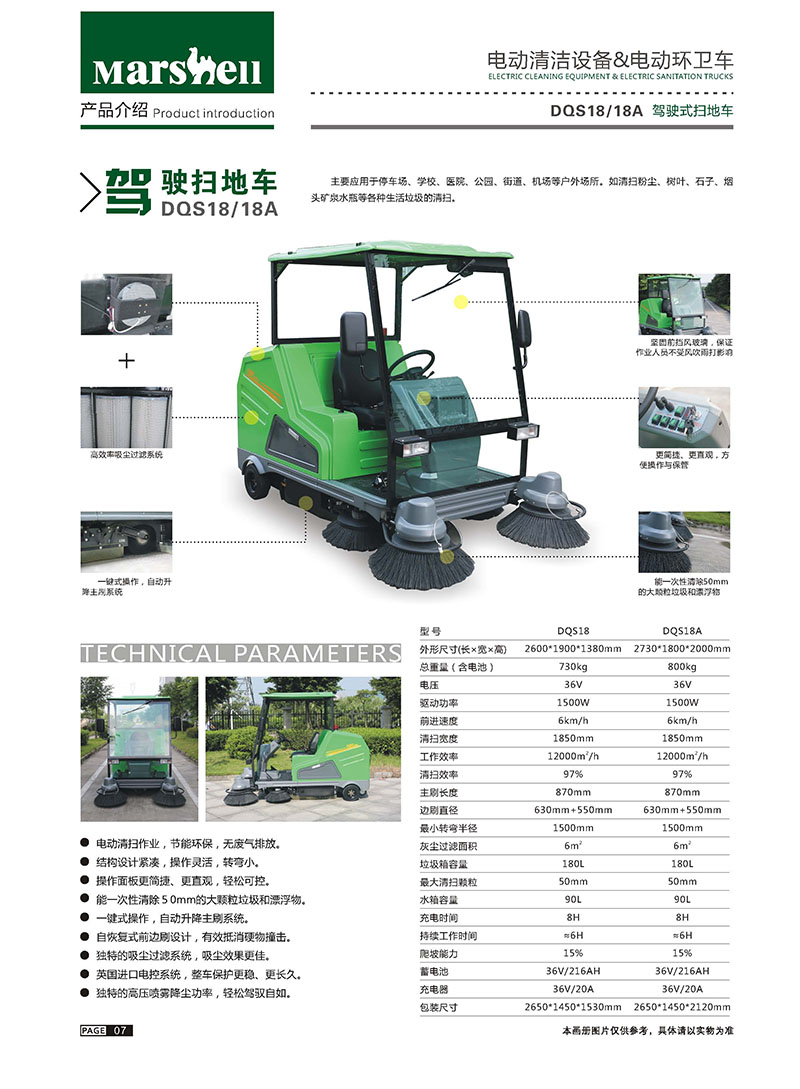 玛西尔扫地机DQS18具备高效灵便、配置多样和省力高效等特点,主要应用于停车场、车间、小区、学校、医院、公园等户外道路及公共场所,如清扫粉尘、树叶、石子、烟头等生活垃圾的清扫与清洁。