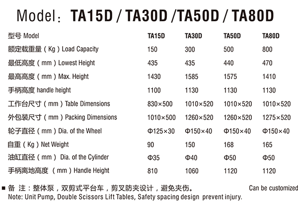 备注:整体泵,双剪式平台车,剪叉防夹设计,避免夹伤 | ||||